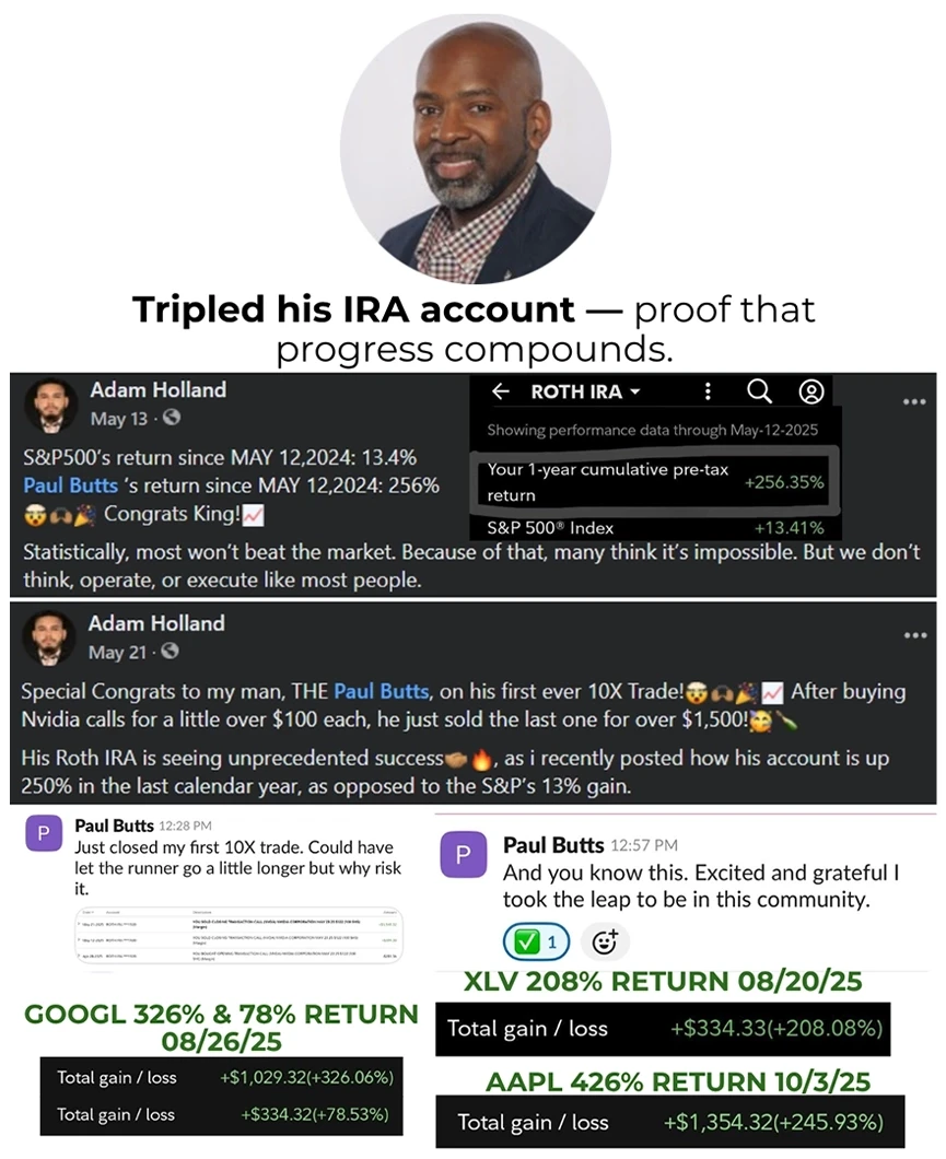 Adam Holland is a full-time stock options trader and the creator of the Stock Options Made Easy system. First developed in 2018 and revamped as the Stock Options Made Easy V2 Training in 2024. He built this community for people who want clarity, structure, and a mentor in their corner while learning to trade. Adam is known for breaking complex concepts into simple steps anyone can follow. He has helped hundreds of everyday people — from kids and seniors to busy professionals — place their first trade, understand the market with confidence, and grow their accounts steadily over time. All while avoiding the boom-and-bust account cycles that hold many traders back, through intentional risk management, account management, and trading mindset practices. Inside Slack, Adam is hands-on during market hours, answering questions, reviewing trade ideas, posting trade breakdowns, and helping members build real skill instead of relying on guesses or hype. If you want a mentor who teaches with patience, clarity, and a genuine interest in your success, you’ll feel right at home here.
